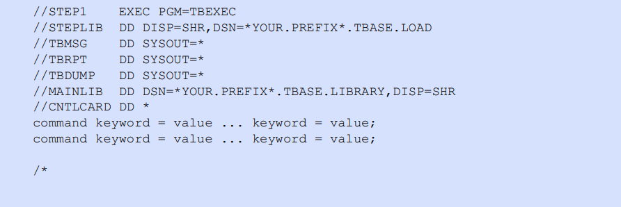 Notices Preface Audience for this Guide What is covered in this Guide What is new in Version 7 Naming protocol What you should know to use this guide Glossary Conventions used in this Guide What this Guide Contains Additional tableBASE references VTS Manager References Customer Support Training and Professional Services About DataKinetics The Batch Utility Programs TBEXEC (DK1TEXEC) commands Command summary Interpreting command parameters Parameter descriptions CHANGE command Option 1: change the definition of a table Option 2: change an Alternate Index definition CHANGE command use CLEAR command CLEAR CLEAR command use COPY command Option 1: copy a table generation Option 2: copy a table (all generations) Option 3: copy a library COPY command use DEFINE command Option 1: initialize a new tableBASE library Option 2: define a new table Option 3: create an Alternate Index definition DEFINE command use DELETE command Option 1: delete a single table generation Option 2: delete all generations of a table DELETE command use EXPAND library command EXPAND command use EXPORT command Option 1: export an entire library Option 2: export a specific table EXPORT command use IMPORT command IMPORT command use LOAD command LOAD command use PRINT command Option 1: list directory Option 2: print table information Option 3: print table contents PRINT command use RENAME command RENAME command use SET command SET command use UNLOAD command UNLOAD command use UPDATE command UPDATE command use Using TBEXEC (DK1TEXEC) JCL to run TBEXEC Create a new tableBASE library EXPORT and IMPORT a tableBASE library UNLOAD a table LOAD a table Error diagnosis Command interpretation errors Command processing errors TBLBASE processing errors Report descriptions TBMSG report TBRPT report Error and audit messages described Table printing utility: TBPRINT (DK1TPTBL) Completion codes Keyword parameters Keywords with assigned values Keywords without assigned values Formatted print examples Print table using defaults Print with row identification Print with row truncation Print with rows continuing on next page JCL View printing utility: TBDEFPRT (DK1TVWPR) Input Output General syntax rules for input Keyword parameters FROMDDN FROMDSN SEQ SELECT EXCLUDE PASSWORD JCL Generating data definitions: TBCOBFD and DK1TCSTR Generating COBOL copybooks Coding conventions Using TBCOBFD Generating C/C++ structures Using DK1TCSTR Table comparison utility: TBCOMP (DK1TCOMP) Using difference files with TBEXEC Library conversion utilities tableBASE Messages TBEXEC error messages tableBASE messages TBEXEC and library conversion messages TBOPT dataset coding Home / Documentation Archive / tableBASE Batch Utilities Guide / Using TBEXEC (DK1TEXEC) JCL to run TBEXEC Figure 113. JCL to run TBEXEC Note: TBRPT is required only if reports are to be produced Create a new tableBASE library EXPORT and IMPORT a tableBASE library UNLOAD a table LOAD a table Doc navigation Error diagnosis >