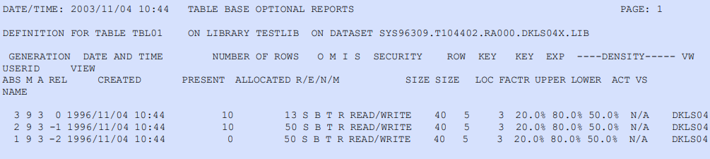 The TBRPT report prints selected tables and their related definitions in character format, hexadecimal format, or both. To print columnar-style reports based on the formatting information contained in the Views, see Table printing utility: TBPRINT (DK1TPTBL).