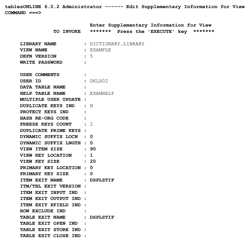 There is a safety feature to prevent illogical changes from this screen. If Library Name and/or View Name has been changed, then tablesONLINE rejects the first attempt to store the modified trailer with the <PF2> key. Instead, it reads in the data for the new table so that it can be modified. It will not allow you to store supplementary information you have not read.